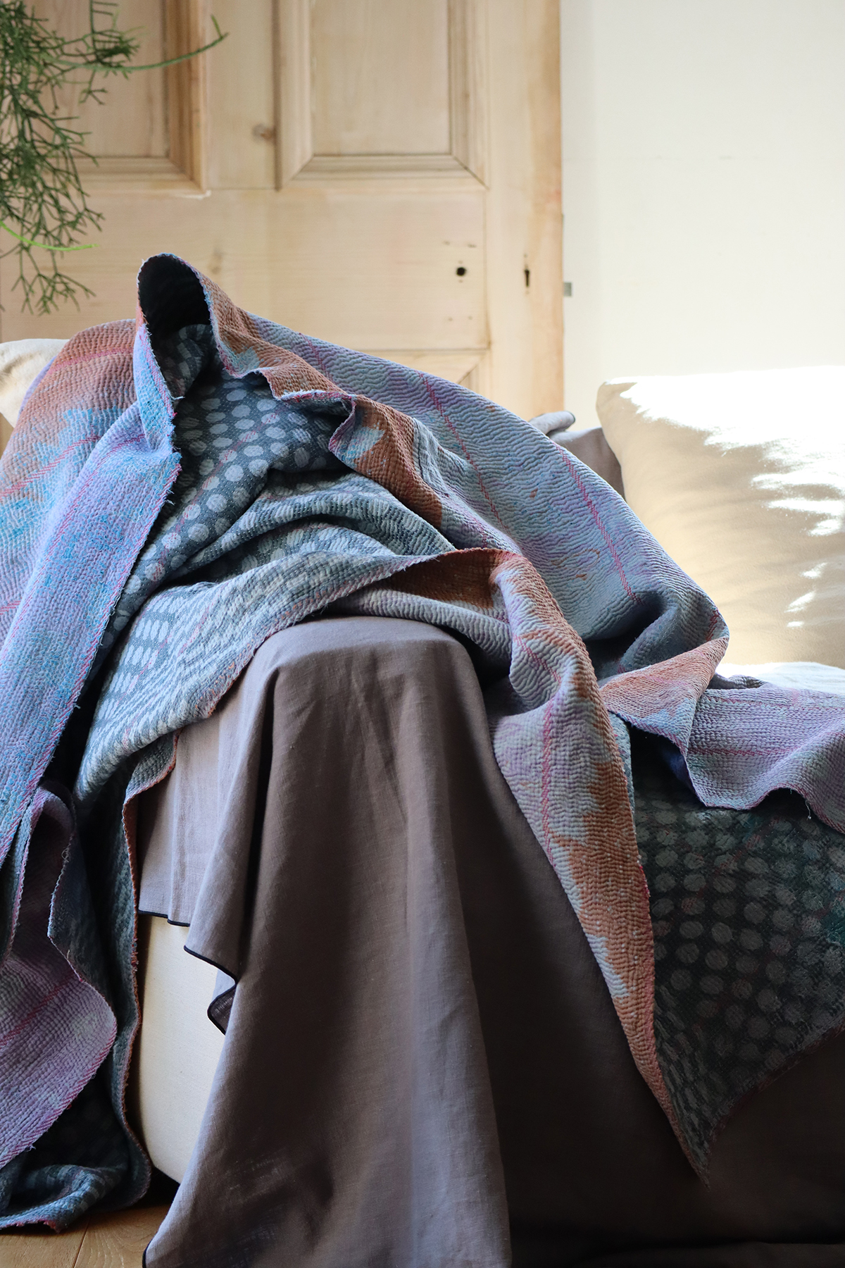 こちらはインド現地の染職人と取引先ディ−ラ−の協力の元、当店のオリジナルグレーカラ−に染め上げた製品です。一枚一枚状態の良いカンタの見極めから染まり具合の確認等とても時間を要しましたが、納得のいく仕上がりになりました。ドットスクエアのパターンがよりインテリアに溶け込むように淡いブルーグレーを選択、反対面は薄いパープルのニュアンスカラーです。さり気なく入るピンクのライン状刺繍も良きアクセント。風合いも柔らかくヴィンテージならではの、こなれ感もあり贅沢な一枚。吊るしてもカバーにしても多様にお楽しみいただけます。
