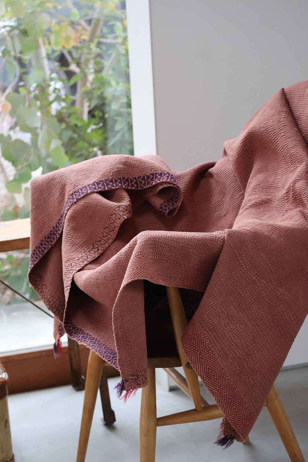 こちらのカンタはインド現地の染職人と取引先ディ−ラ−の協力の元、当店のオリジナルキャメルブラウンに染めた製品。染前の状態は白地のカンタに青と赤の縁の刺繍が入る爽やかな印象でした。そのままでも十分なところからまた手を加えたところ、深みある優しいカンタへ。商品画像にて掲載しているようにこちらのカンタには、穴埋めを同色でダーニングした箇所がございます。大きな丸で2センチ程個人的にとても心擽られる嬉しいポイント、緻密なステッチのカンタのみに生まれる波打つ畝の陰影も魅力の一つ。非常に柔らかいので上掛けがオススメです、季節問わず通年お楽しみいただけます。