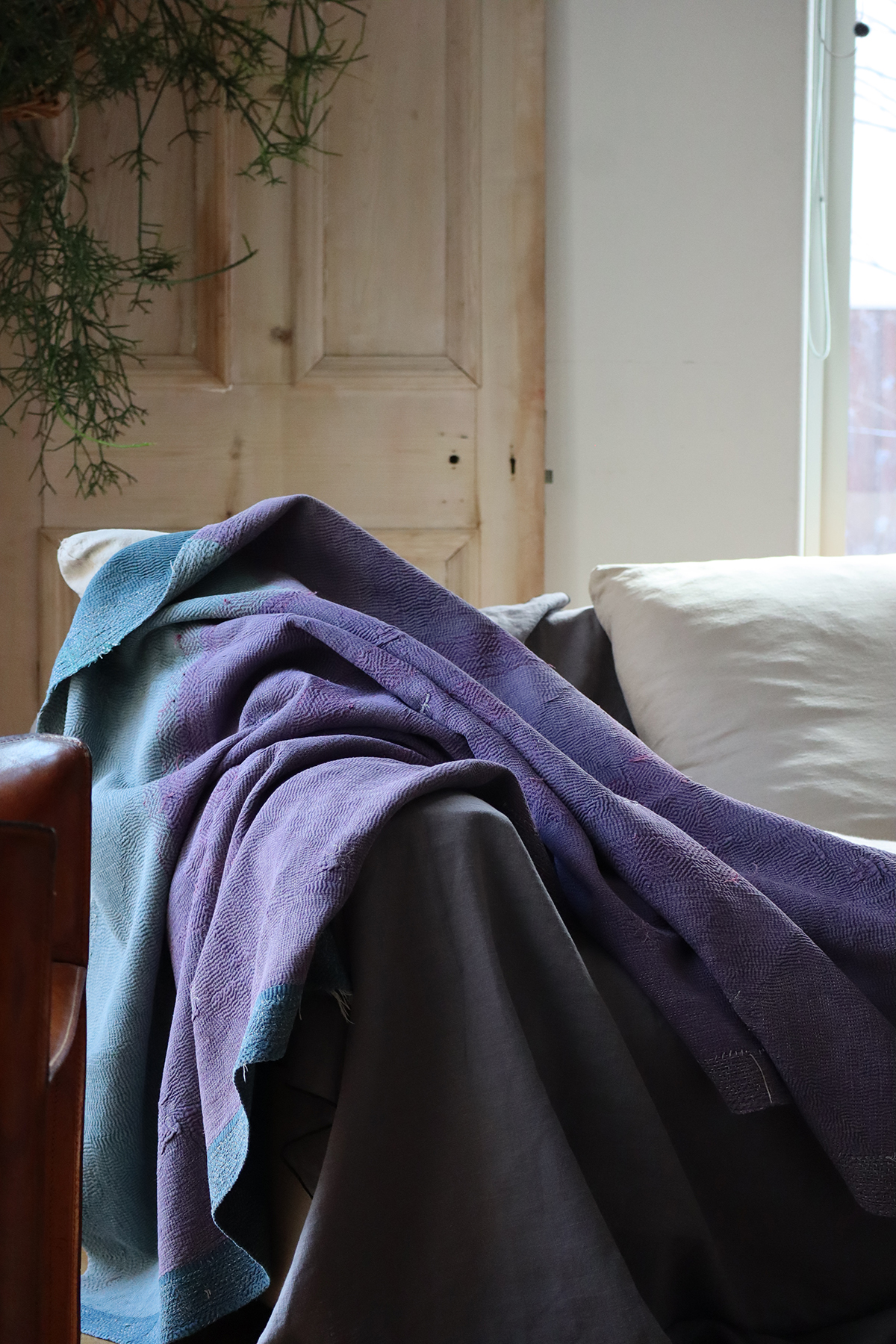 こちらのカンタはインド現地の染職人と取引先ディ−ラ−の協力の元、当店のオリジナルグレーカラ−に染め上げた製品です。一枚一枚状態の良いカンタの見極めから染まり具合の確認等とても時間を要しました。元はもっと発色の良い青のカンタにごく僅かな染料でグレーを乗せています。結果表裏共にくすんだ柔らかな印象へと表情を変えました。刺し子ステッチのピッチも素晴らしく緻密な運針や細かい刺繍モチーフも魅力の一つ。きちんとした印象ですので新生活に向けての軽やかな一枚にぴったりです。