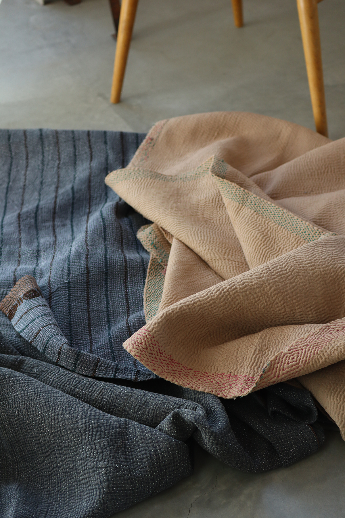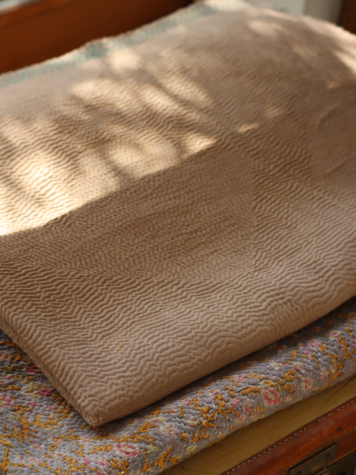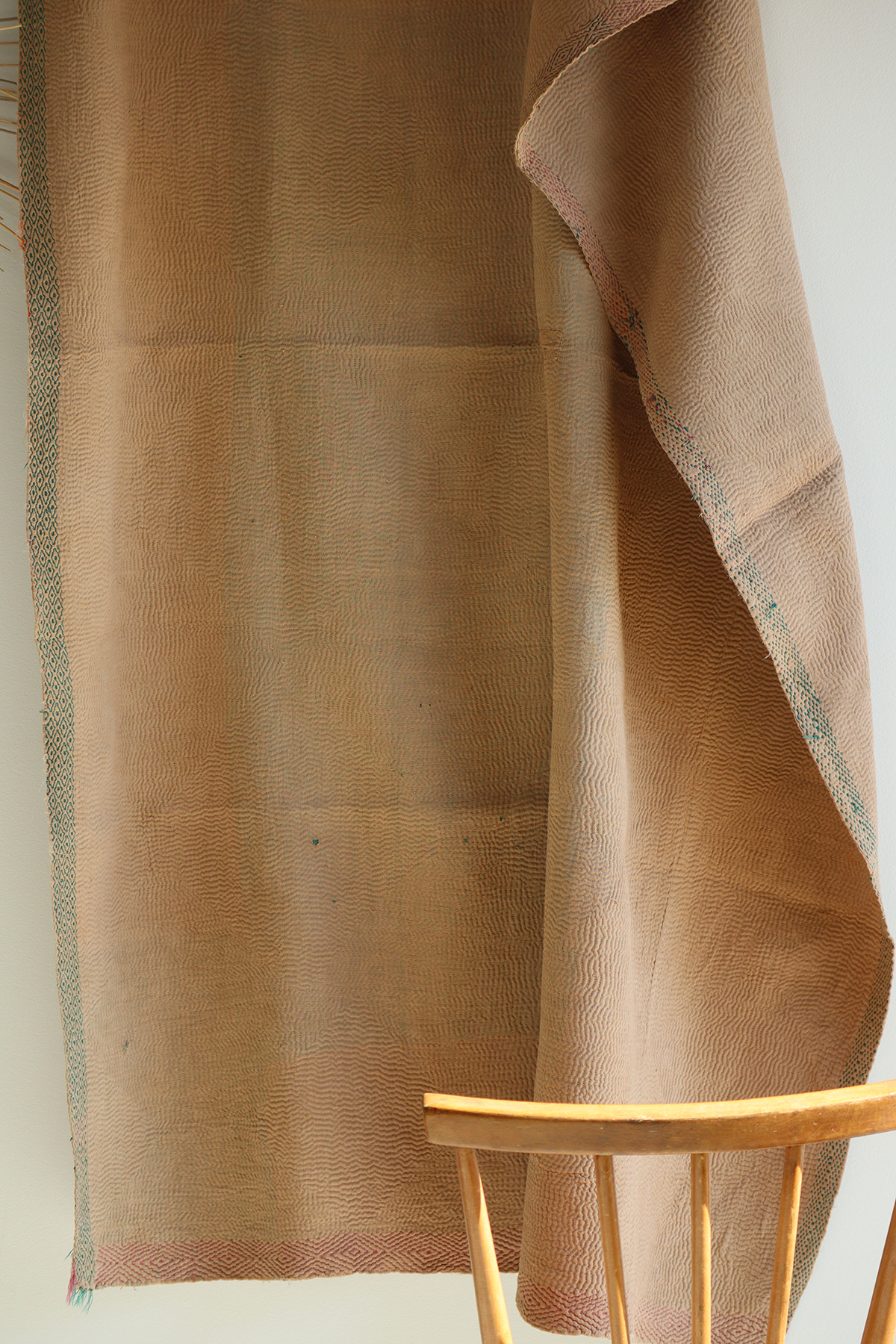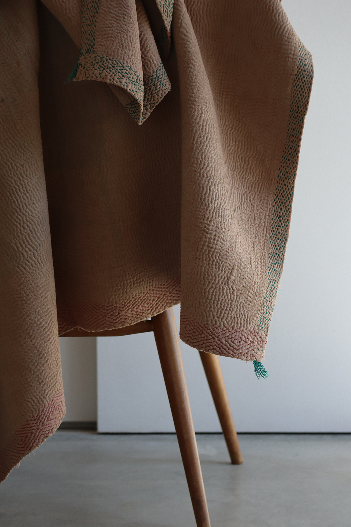 大判のカンタより少し小ぶりのサイズ感は個人的に使いやすいのでつい集めてしまいます。表裏共に同色のベージュカラ−、ぐるり周りの刺繍はパターンを変え刺すのを辞めた部分はインドらしさが垣間見れるチャームポイント。波打つ表面の畝による陰影はベーシックカンタの最大の魅力、日常使いに是非お役立てください。