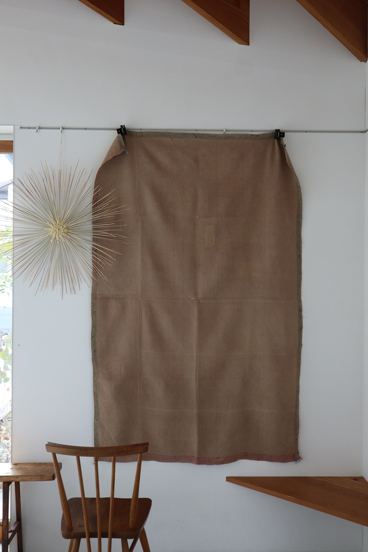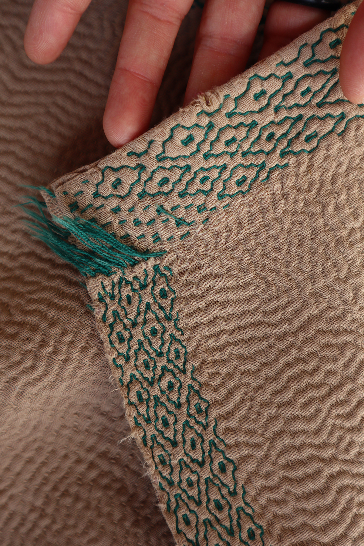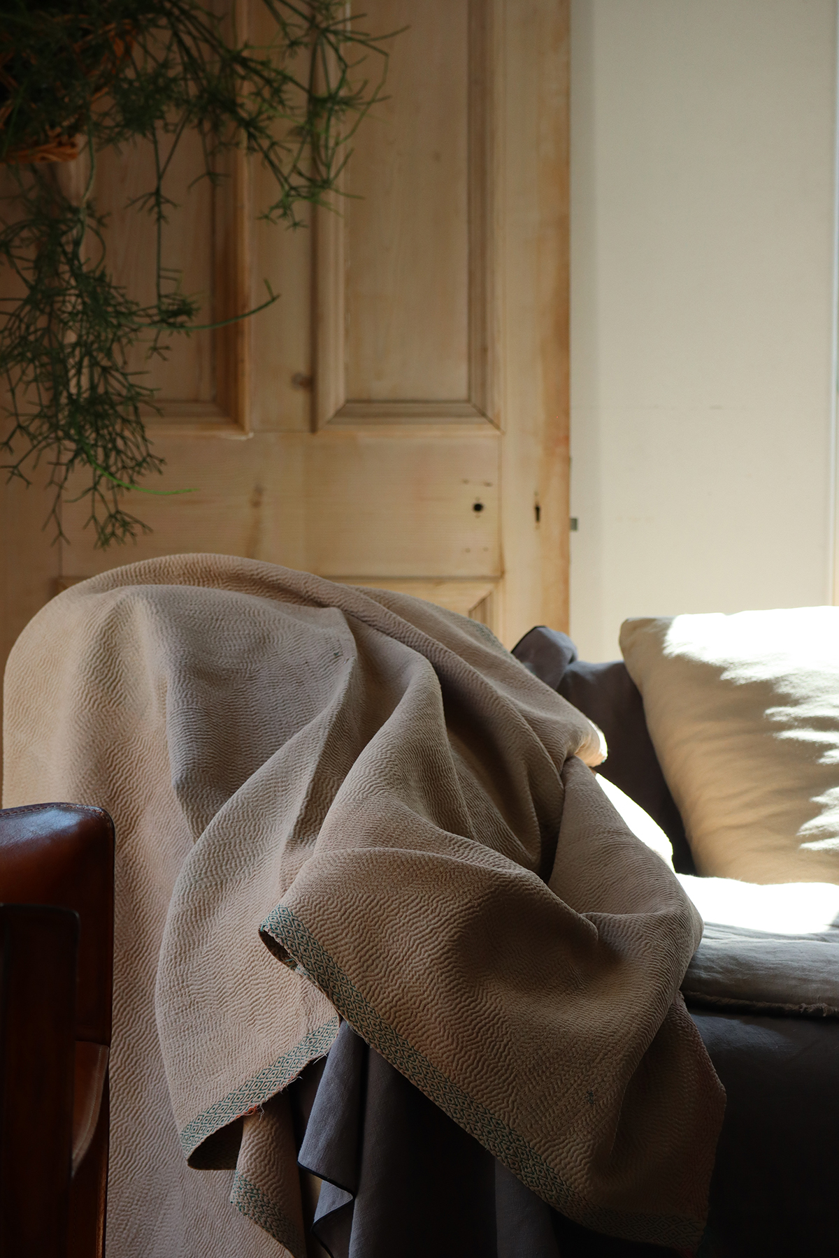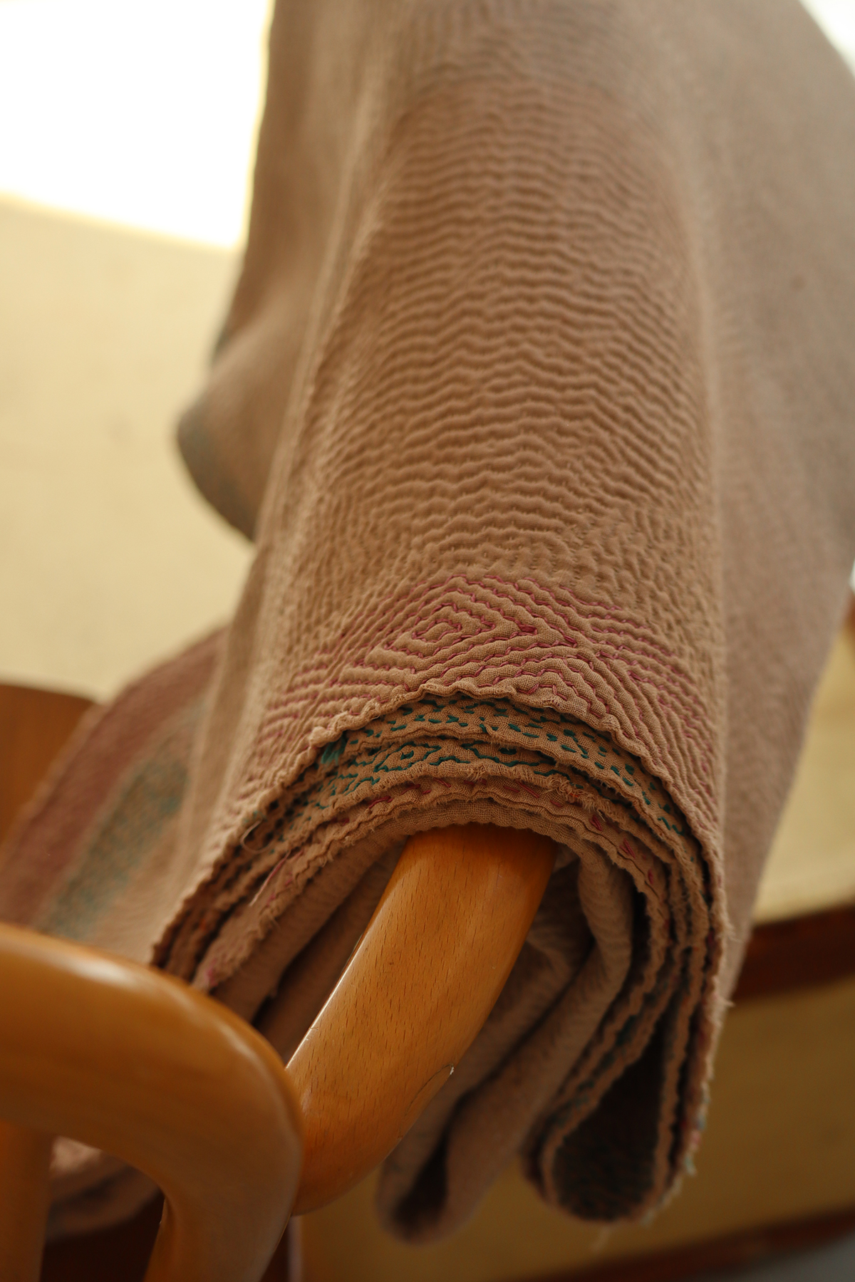 大判のカンタより少し小ぶりのサイズ感は個人的に使いやすいのでつい集めてしまいます。表裏共に同色のベージュカラ−、ぐるり周りの刺繍はパターンを変え刺すのを辞めた部分はインドらしさが垣間見れるチャームポイント。波打つ表面の畝による陰影はベーシックカンタの最大の魅力、日常使いに是非お役立てください。